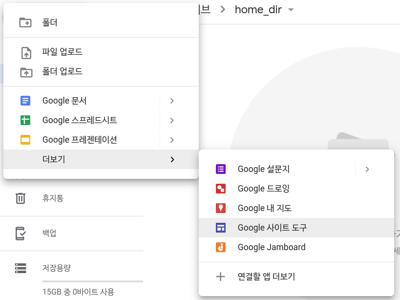 4. 생성한 폴더로 이동한 후 다시 '+새로 만들기' > 더보기 > Google 사이트 도구