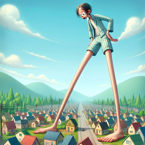 그 순간, 미누는 기지개를 켰습니다. 하지만 이번에는 달랐어요. 그의 다리가 쭉 늘어나기 시작했습니다. 미누의 다리는 멈추지 않고 계속 길어지기 시작했고, 이내 우리 집을 넘어, 옆집을 넘어, 마을 전체를 넘어서 바다를 건너가기 시작했습니다. 마을 사람들과 거리의 모든 것들이 눈 아래 작아지는 것을 보며, 미누는 자신이 거대한 걸음으로 세상을 넘나들고 있다는 사실에 깜짝 놀랐습니다.