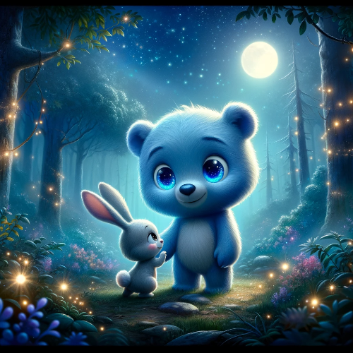 Once upon a time, deep in the forest, there lived a little bear with blue eyes. The bear's name was Blue. Blue's blue eyes sparkled like starlight and shone even in the darkness. Although Blue was known among the forest friends as the bravest, the truth was that he felt a bit scared at night.