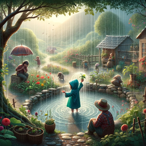 As an adult, Ray created a beautiful garden in the village. This garden became even more beautiful on rainy days. Based on their childhood experiences, Ray taught the villagers how to live in harmony with nature. Ray's garden brought peace and happiness to the people and reminded them of the importance of rain.