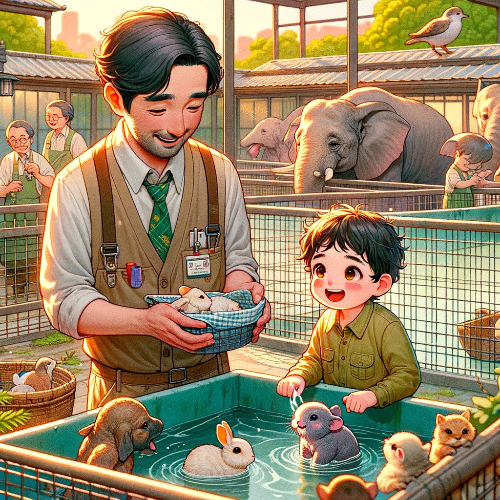 Early in the morning, Kiru arrived at the zoo with excitement filling his heart. Mr. Lee, the zookeeper, warmly welcomed Kiru and began teaching him the basics of animal care. Kiru's first task was to take care of the small animals.