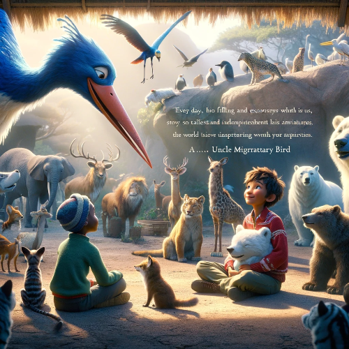 Kiru, a young boy who had just started working at the zoo, found every day filled with new discoveries and adventures. One day, a special visitor named Skye came to the zoo. He was a migratory bird who flew to the zoo around this time every year to share stories of his travels around the world with the animals, who warmly greeted him as Uncle Skye.