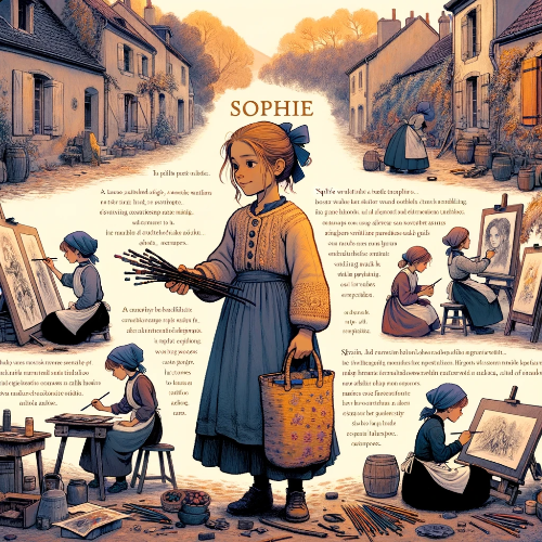 In a small village in France, there lived a young girl named Sophie. Sophie loved drawing more than anything else. From a young age, she captured the beauty of nature, the everyday lives of the villagers, and the fantasy world she dreamed of on paper. However, Sophie's family was poor, and they always struggled to afford the materials needed for her drawings.