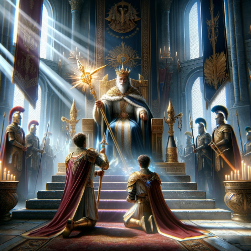 왕은 세월이 흘러 늙어가면서 자신의 두 아들에게 이 신성한 무기를 물려주었습니다. 큰아들에게는 신의 창을, 작은아들에게는 신의 방패를 주었죠. 처음에는 형제들이 이 무기들로 왕국을 수호하며 여러 전투에서 승리를 거두었습니다. 그들의 용맹함과 무기의 힘은 주변 나라들 사이에서도 유명해졌습니다.