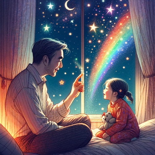 아빠는 미소지으며 고개를 끄덕였어요. "그래, 다인아. 네가 잠들기 전, 창문 밖으로 밤하늘을 바라보면, 무지개를 숨겨놓은 별들을 찾을 수 있을 거야. 그 별들은 항상 거기 있으면서, 우리에게 아름다운 무지개를 다시 보여주기를 기다리고 있단다."
