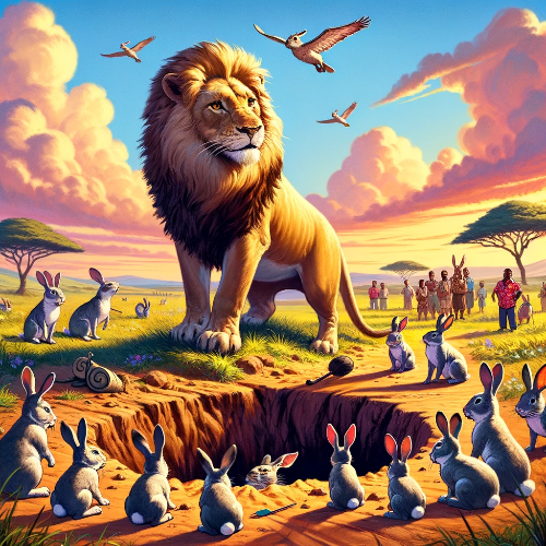 The rabbits, tired of Leo's constant harassment, devised a plan. They dug a large pit along the path Leo frequented and covered it up. When Leo came by, he fell right into the pit. The rabbits taught Leo the importance of cooperation and respecting others. Initially, Leo was angry and threatened the rabbits, but he gradually began to reflect on his actions.