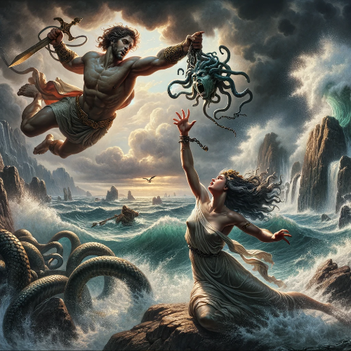 하지만 이때, 용맹한 영웅 페르세우스가 황금빛 날개 신발을 신고 하늘을 나는 모습으로 등장했습니다. 그는 메두사의 머리, 즉 누구든 그것을 바라보면 돌이 되어 버리는 무서운 무기를 들고 있었습니다. 페르세우스는 안드로메다의 아름다움에 매혹되어 그녀를 구하기로 결심했습니다.