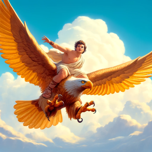제우스는 그를 올림포스로 데려가고 싶어 안달이 났습니다. 그러나 그렇게 하려면 무언가 특별한 방법이 필요했습니다. 결국 제우스는 황금의 독수리로 변신하여 푸른 하늘을 가르며 트로이의 들판으로 날아갔습니다. 가니메데스가 양 떼와 노닐 때, 독수리는 그를 부드럽게 감싸 안고 하늘로 솟구쳤습니다.