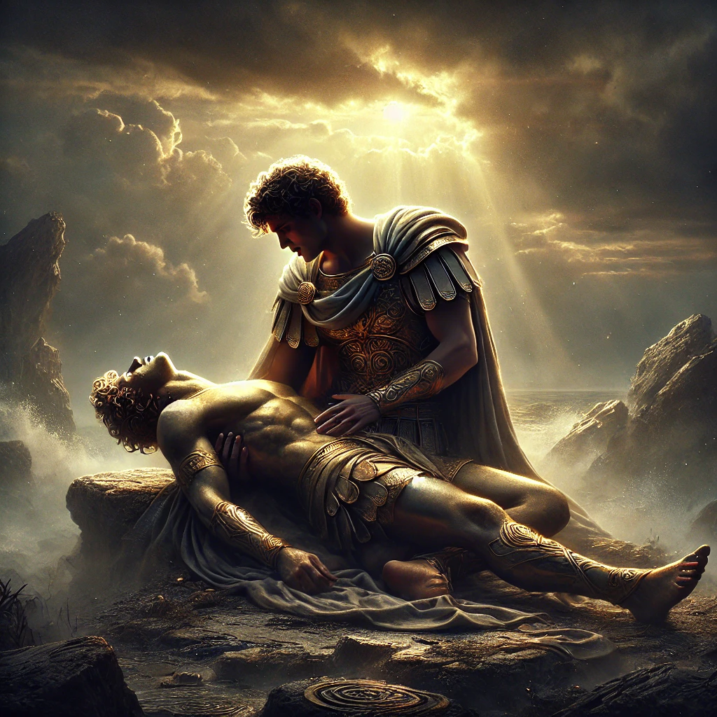 그러나 모든 것이 평화롭지는 않았습니다. 어느 날, 형제는 악명 높은 소 도둑의 무리를 소탕하기 위한 전투에 나섰습니다. 이 싸움은 그들의 용맹함을 보여주는 사건이었지만 동시에 비극의 시작이기도 했습니다. 치열한 전투 끝에 카스토르는 치명적인 부상을 입고 쓰러지고 말았습니다. 폴룩스는 형의 몸을 끌어안고 하염없이 울며 그의 곁을 떠나지 않았습니다. 형의 생명을 구하기 위해 그는 불사의 능력을 스스로 포기할 준비가 되어 있었습니다.